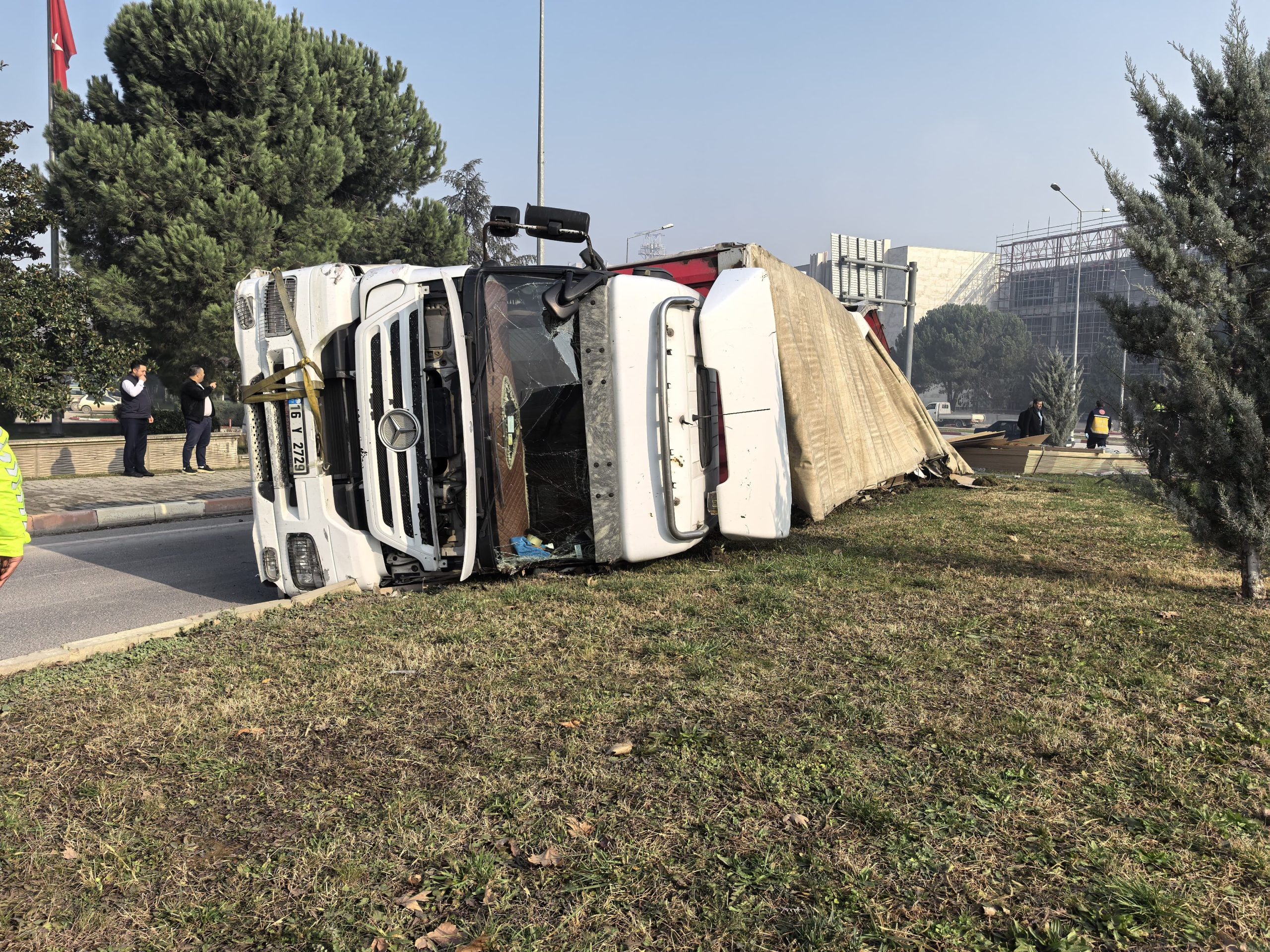 Kaza, saat 12.00 sıralarında Süleymaniye Mahallesi İnegöl Organize Sanayi Bölgesi Hikmet Şahin Köprülü Kavşağı’nda meydana geldi. Sürücü Mustafa Menteş (22), 16 Y 2729 plakalı tıra OSB’de faaliyet gösteren orman ürünleri fabrikasından yüklediği suntaları Gemlik ilçe limanına götürmek üzere yola çıktı. Kavşaktan dönüş yapmakta olan tır, sürücüsünün kontrolünden çıkarak devrildi. Devrilen tırın dorsesindeki suntalar yola saçıldı. Kaza sonucu kavşağın bir yönü ulaşıma kapanırken, sürücü kısa süreli şok yaşadı.